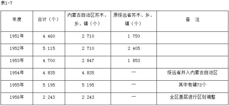 1956年3月21日,內(nèi)蒙古自治區(qū)人民委員會為適應(yīng)農(nóng)業(yè)合作化發(fā)展的需要,在第一次基層換屆選舉時,發(fā)出《內(nèi)蒙古自治區(qū)調(diào)整農(nóng)業(yè)區(qū)、半農(nóng)半牧區(qū)嘎查、鄉(xiāng)的行政區(qū)劃和編制的試行方案》。經(jīng)過這次調(diào)整,適當(dāng)擴大了蘇木、鄉(xiāng)的區(qū)域。全區(qū)由原5122個蘇木、嘎查、鄉(xiāng),調(diào)整為2243個蘇木、嘎查、鄉(xiāng)。當(dāng)年,全區(qū)已建立農(nóng)牧業(yè)高級合作社(簡稱高級社)9622個。詳見表1-7。