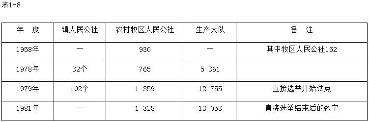 1966年5月16日以后,在“文化大革命”期間,全區(qū)蘇木、鄉(xiāng)、民族鄉(xiāng)、鎮(zhèn)從1967年開始,陸續(xù)成立革命委員會,取代了人民公社管理委員會。由干部、軍隊代表、群眾組織頭頭組成所謂“三結(jié)合”革命委員會領(lǐng)導(dǎo)班子。人民公社革命委員會由主任、副主任、委員組成。下設(shè)助理員若干,辦理各項事務(wù)。1979年7月4日公布的第五屆全國人民代表大會第二次會議通過的修正《中華人民共和國地方各級人民代表大會和地方各級人民政府組織法》規(guī)定,人民公社設(shè)人民代表大會和管理委員會,人民代表大會代表由選民直接選舉。內(nèi)蒙古自治區(qū)從1979年11月開始,旗縣和人民公社、鎮(zhèn)進(jìn)行直接選舉試點,到1981年11月完成人民公社選舉,選出人民公社管理委員會主任、副主任和委員。人民公社的權(quán)力機關(guān)是人民代表大會,管理機關(guān)是人民公社管理委員會。幾個年度人民公社情況見表1-8和表1-9。