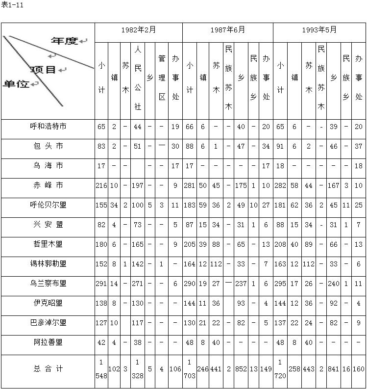 注:表內(nèi)數(shù)字依據(jù)民政廳1982年、1987年、1993年《內(nèi)蒙古自治區(qū)行政區(qū)劃簡冊》統(tǒng)計的。此表反映出全區(qū)基層行政區(qū)域建制單位和派出機關(guān)在改革中的變化。