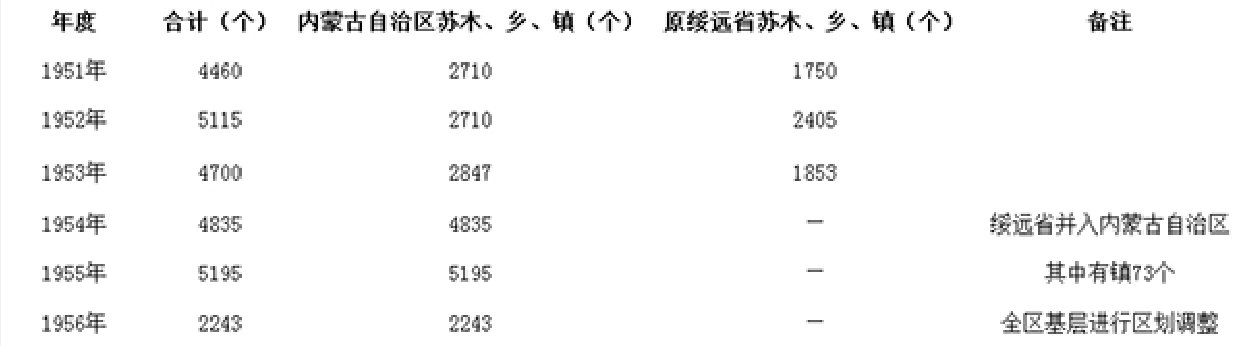 1951—1956年內蒙古自治區(qū)基層行政區(qū)域建制單位統(tǒng)計表