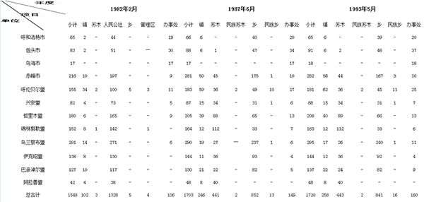注:表內數(shù)字依據(jù)民政廳1982年、1987年、1993年《內蒙古自治區(qū)行政區(qū)劃簡冊》統(tǒng)計的。此表反映出全區(qū)基層行政區(qū)域建制單位和派出機關在改革中的變化。