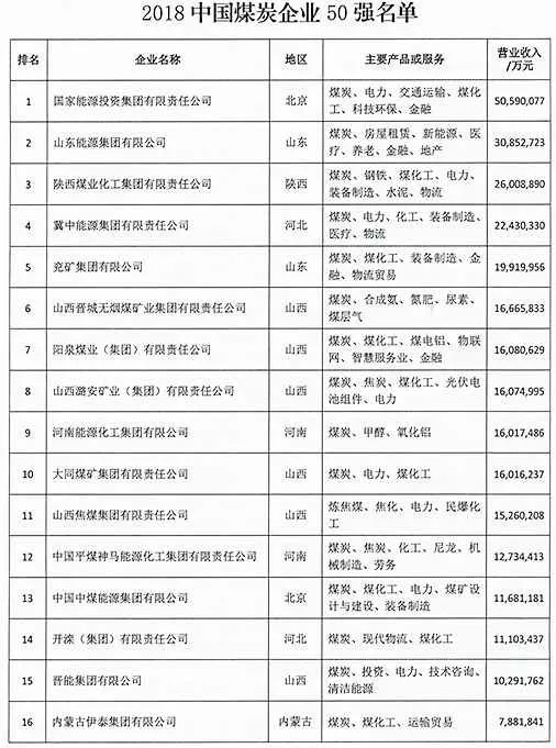 2018年中國(guó)煤炭企業(yè)50強(qiáng)榜單發(fā)布。據(jù)榜單顯示,國(guó)家能源投資集團(tuán)有限責(zé)任公司排名第一,2017年?duì)I業(yè)收入為5059.01億元。排名第二的為山東能源集團(tuán)有限公司,2017年?duì)I業(yè)收入為3085.27億元。陜西煤業(yè)化工集團(tuán)有限責(zé)任公司排名第三,2017年?duì)I業(yè)收入為2600.89億元。