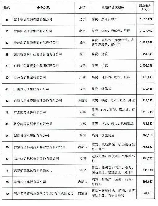 內(nèi)蒙古6家煤企上榜,分別是:內(nèi)蒙古伊泰集團(tuán)有限公司,位列榜單第16位;內(nèi)蒙古蒙泰煤電集團(tuán)有限公司,位列榜單第34位;內(nèi)蒙古伊東資源集團(tuán)股份有限公司,位列榜單第42位;內(nèi)蒙古霍林河露天煤業(yè)股份有限公司,位列榜單第46位;滿世投資集團(tuán)有限公司,位列榜單第49位;鄂爾多斯市烏蘭煤炭(集團(tuán))有限責(zé)任公司,位列榜單第50位。