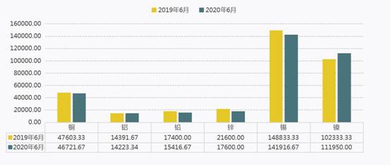 6月全區(qū)有色金屬價(jià)格對(duì)比(2019—2020年)
