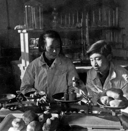 1962年烏蘭察布盟農(nóng)業(yè)科學(xué)研究所馬鈴薯研究小組人員正在測(cè)定馬鈴薯的淀粉成分。