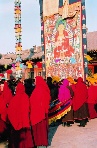 作為內(nèi)蒙古地區(qū)藏傳佛教的活動中心,大召每年都要舉行一些盛大的佛事活動。如每年農(nóng)歷正月十五和六月十五的晾大佛、跳恰木;農(nóng)歷五月十三的祭敖包;農(nóng)歷八月十四到十七的嘛呢會;農(nóng)歷十月二十五紀(jì)念宗喀巴大師的燈明法會等。
