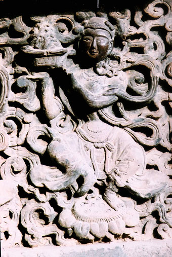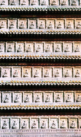 金剛座舍利寶塔是一組巨大的雕刻藝術(shù)群。塔體表面全被精美的裝飾圖案覆蓋,僅佛像就有1 630余尊。此外,還塑有菩薩、羅漢、天王、仙女、瑞獸、珍寶、神鳥、神獸、菩提樹、法器等眾多的形象圖案。其雕飾內(nèi)容多彩,雕工技藝精湛嫻熟,人物造型形態(tài)逼真,堪稱一絕,在歷代古建筑中也少見。在塔背后的