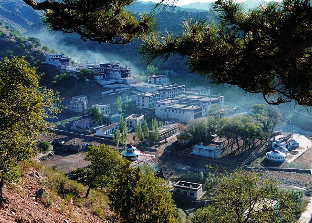 五當(dāng)召始建于清康熙年間,以西藏扎什倫布寺為藍本,經(jīng)乾隆、嘉慶、光緒年間多次維修、擴建,遂成今日規(guī)模。寺廟被群山環(huán)抱,山上蒼松翠柳,郁郁蔥蔥,寺前小溪清澈,流水涓涓。整個寺院依山勢建造,規(guī)模宏大,殿堂倉舍2 538間,占地約20萬平方米,鼎盛時喇嘛1 200多人。所有建筑均采用藏式結(jié)構(gòu):平頂、直墻、小窗、白色,整個寺院與山巔松柏輝映,顯得十分精美壯觀。五當(dāng)召內(nèi)有金、銀、銅、木、泥各種質(zhì)料制成的佛像1 500余尊,其中最大的有三層樓高,最小的不過盈寸。寺內(nèi)現(xiàn)存的大量壁畫,精細逼真地描繪了歷史人物、風(fēng)俗、神話及山水花鳥,是研究少數(shù)民族歷史文化的寶貴資料。現(xiàn)在,五當(dāng)召依然是本召喇嘛進行佛事活動和信徒們朝拜的場所。這里每年舉行“嘛呢會”等佛事活動。寺廟兩側(cè)各聳立一座白塔,四周白土樓星羅棋布,各殿頂有風(fēng)磨銅雙羚羊?qū)εP法輪和廟徽,陽光下金光璀璨,樹立在茂密的松柏之間,顯得格外莊嚴(yán)壯觀。