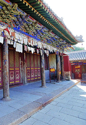 福緣寺建于一條中軸線上,由南而北一連四重殿宇,即山門殿、誦經殿、佛殿和老爺廟等建筑群組成。占地面積約4 000平方米。清廷賜名“福緣寺”,但當地人習稱為“下倉”。在這些建筑群中,誦經殿為藏式二層建筑。誦經殿后為佛殿,是福緣寺主廟。這是一座五間重檐宮殿頂建筑,其重檐下三層斗拱,層層伸出,花板彩繪。前檐出廊,內外檐的梁、柱都有旋子,以及方格天花板和多邊形藻井均為彩繪雕刻,裝飾精細。其建筑在錫埒圖庫倫所有寺廟中獨具一格。佛殿的背后有兩株高大的樹,左為松,右為柏。這兩顆樹為如今庫倫旗唯一的古樹,大約是在建廟的同一時期栽植的。在這兩棵樹的后面為老爺廟,為硬山頂兩層建筑。