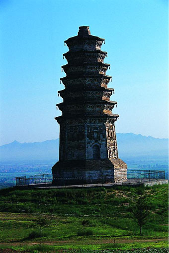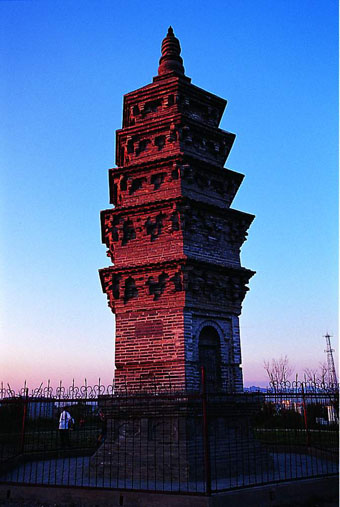 南塔位于遼上京遺址南約5公里的賬房山山麓,與北塔遙相呼應(yīng),塔高25米,八角七檐,檐頭系風(fēng)鈴;塔身嵌有浮雕,可稱為遼代藝術(shù)珍品。據(jù)考證,此塔為開悟寺舍利塔。可以想象,當(dāng)時遼上京南北山上,佛塔高聳,風(fēng)鈴飄鳴,誦經(jīng)聲聲,一派佛國盛世景象。