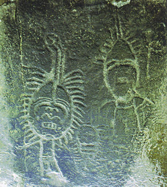 陰山巖畫紛繁若錦。不同的題材內(nèi)容在磨刻地點(diǎn)的選擇上也有規(guī)律可循。各種野生動(dòng)物圖像多出現(xiàn)在山顛巖石上;狩獵場面一般分布在山腰或山頂;神靈頭像和天體星圖幾乎全部磨刻在山溝的垂直立壁或溝邊坡岸的巨石上,原始人有神靈居于水流湍急之處的思想意識。