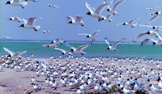遺鷗的樣子很獨(dú)特,保護(hù)區(qū)當(dāng)?shù)氐睦相l(xiāng)們非常喜歡這種鳥,它憨態(tài)可掬,白身灰翅,黑黑的頭上襯著半圓的眼圈,儼然“沉思”狀,如果發(fā)現(xiàn)人對(duì)它心存善意,即便你走近時(shí)它也不飛走。在很多人眼里,遺鷗還是一種很神秘的鳥,每年的3、4月,它們不知從何處陸續(xù)返回春寒陡峭的鄂爾多斯高原繁殖地,開始掘坑營巢,作“生兒育女”的準(zhǔn)備,等到雛鳥出殼后,它們就分散在鄂爾多斯高原的湖泊和濕地里生活。遺鷗喜歡群居,并組成穩(wěn)固的家庭,以湖中的泥鰍、小魚和岸邊的蚊蟲為食,悠閑地度過夏季,及至秋涼時(shí)節(jié)則又行色匆匆,帶領(lǐng)長大的幼鳥向南飛往遠(yuǎn)方。至目前為止,遺鷗的越冬地到底在哪里,一直是國際鳥類學(xué)界解不開的疑團(tuán)。