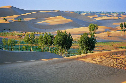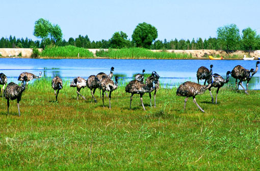 - 從包頭出發(fā),過黃河古渡口和昭君墳,沿專線公路南行70公里,便到了沙漠中的海市蜃樓—恩格貝公園。恩格貝創(chuàng)造了一個藝術(shù)地對立統(tǒng)一模式:黃色的沙漠中,一片綠樹舒枝展葉;干涸的沙丘間,一汪湖水碧如明鏡;人跡少見之地,如今鴕鳥起舞,孔雀朝陽。它位于鄂爾多斯市庫布其大漠腹地,距達拉特旗文化古跡昭君墳約15公里。恩格貝為蒙古語,漢譯為“平安、吉祥”之意。恩格貝開發(fā)利用于1989年。開發(fā)總面積達30萬畝,整個開發(fā)區(qū)種樹種草3萬畝,其中,果樹、花圃、名貴藥材等1 200多畝。植被覆蓋率達85%以上。區(qū)內(nèi)飼養(yǎng)動物10余種1萬頭(只),其中,有珍貴的中華絨山羊3 000余只,鴨、鵝6 000余只,駝鳥100余只,孔雀100余只。有大型水庫3座,各種人工小湖10余處,蓄水量達400余萬立方米,還開發(fā)出了礦泉水,有月亮湖、飛來湖、天外石等資源、景觀。