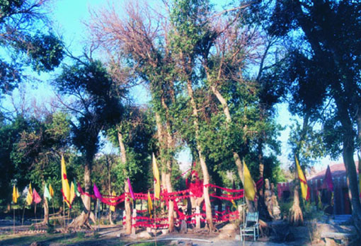 品味著這個耐人尋味的故事,游人們自南向北順?biāo)缕鞯牡谝徽颈愕搅撕鷹顛u。胡楊島由黃河中近鄰的5個島組成,最大的18萬平方米,共計40萬平方米。其中有的島上多蛇蟲,人稱蛇島;有的島上草稀樹少,人稱燒烤島;有的島上黃花茂盛,人稱黃花島。有的島上葦長柳旺,人稱葦柳島;而最著名的就是長著千余株古老胡楊的大島了。胡楊的雄奇特色已有許多記述,此處不再細(xì)說。使人驚奇的是,此島往東往南胡楊均已絕跡。此島的胡楊從何而來?一說是成吉思汗西征的大軍帶來,一說是強(qiáng)勁的沙漠風(fēng)吹來。關(guān)于胡楊島,還流傳著許多神奇的傳說。其中一說就是,曾有兩棵參天胡楊倒入河中,擋住狂風(fēng)暴雨中面臨危難的戰(zhàn)船,救了成吉思汗和他的軍士。胡楊樹倒伏之處崖陡壁峭,斷根猶存,島上人立碑紀(jì)念,取名“救駕崖”。還有一說,講的是一個漢族姑娘和一位少數(shù)民族小伙子的一段純真凄美的愛情故事,他們被封建勢力扼殺后,化作兩棵相依相纏的胡楊樹——這就是胡楊島上最初的公樹和母樹。