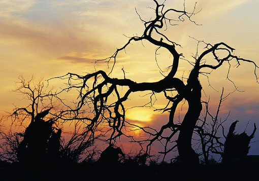 有人感嘆:做人難、做羊難、做樹更難!額濟(jì)納作為世界三大原始胡楊林區(qū)之一,已干涸到令人驚心動(dòng)魄的地步。怪樹林仿佛是上蒼對(duì)我們的一番警示。方圓十幾畝,胡楊陳尸遍地,仿佛掙扎著要從流沙的漩渦中脫身,每一種姿勢都令人怦然心碎。獵獵的大漠風(fēng)沙卷過,彈奏出最凄厲的音符,每一聲都仿佛是對(duì)人類破壞生態(tài)環(huán)境的聲討。