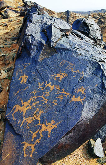 據(jù)巖畫的色澤和水溫水位資料推測,在數(shù)千年前,曼德拉山四周湖水環(huán)繞,水草豐盛。當時曾有許多游牧、狩獵民族在這里繁衍生息,留下了可尋的蹤跡。這滿山的巖畫,精湛生動的藝術(shù)圖案,反映的就是這些民族部落的歷史。