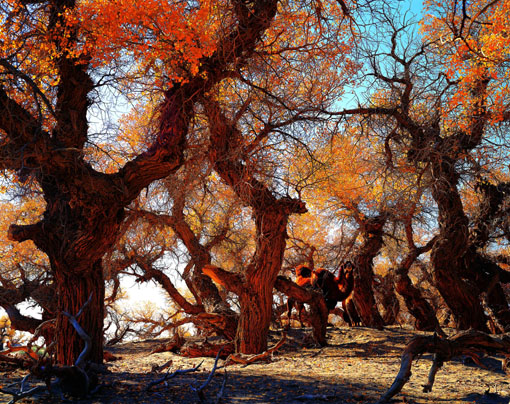 胡楊以它那古老原始的遺種,龍盤虬曲的雄姿,變化無常的葉形,居傲風(fēng)沙鹽堿的特性,以及奇特多樣的繁衍方式,贏得了游人們的虔敬與好奇!