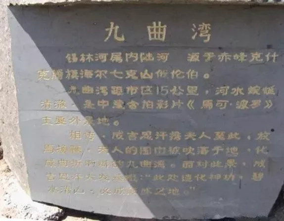 錫林河九曲灣隨地勢(shì)起伏,婀娜多姿;河道彎彎曲曲,宛若一條銀色的飄帶鑲嵌在綠色的地毯上,并與藍(lán)天、白云、牛羊有機(jī)組合,構(gòu)成了一幅仙境般的天然畫卷。中國與意大利合拍的歷史巨片《馬可·波羅》曾在這里拍攝了大量外景鏡頭。1998年,以此景為藍(lán)本發(fā)行了錫林郭勒特種郵票。(摘自《內(nèi)蒙古自治區(qū)志·旅游志》)