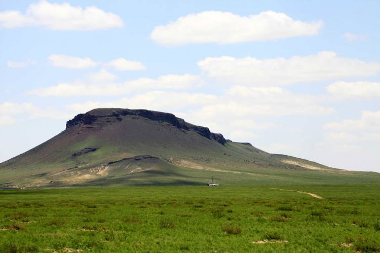 這座在廣袤草原上的雋秀孤山,從南北兩個方向看,成吉思寶格都山都是呈四方形。從西面看則是高矮不齊的兩座山峰,峰頂上都有敖包,高峰上的是旗敖包,矮峰上的是蘇木敖包。從腳下開闊處觀望,自西北向東南,山型宛如一位雍容華貴的婦人。從東南向西北,卻儼然一頭凜凜雄獅。最佳的觀看位置在東側(cè)。從這里可以清楚地看到山形酷似一位沉靜安詳?shù)睦险哳^像,其武纓、頭盔、頭發(fā)、額頭、眼眉、眼睛、鼻梁、上下嘴唇、下領(lǐng)、胡須等都清晰可辨,猶如成吉思汗仰臥沉思,也像是與長生天對話。據(jù)史學專家考證,元太祖六年(1211年),成吉思汗率蒙古大軍南下攻金,取得野狐嶺戰(zhàn)役勝利后,選擇該山祭祀長生天,命名此山為寶格都山(意為圣山),后該地區(qū)百姓稱此山為成吉思寶格都山(意為成吉思汗圣山)。圣山周圍地域廣袤,清澈透明的季節(jié)湖依傍在圣山旁,與它遙遙相望的是天然梯形火山臺地,山中流淌著稀有的火山熔巖礦泉水。圣山北邊環(huán)繞著哈喇土里木湖,雨水豐沛時,一般形成三個湖,好像是祭祀成吉思汗的三尊酒。
