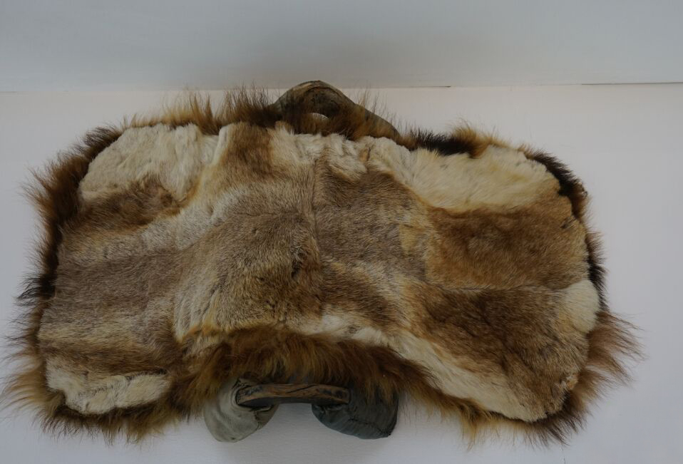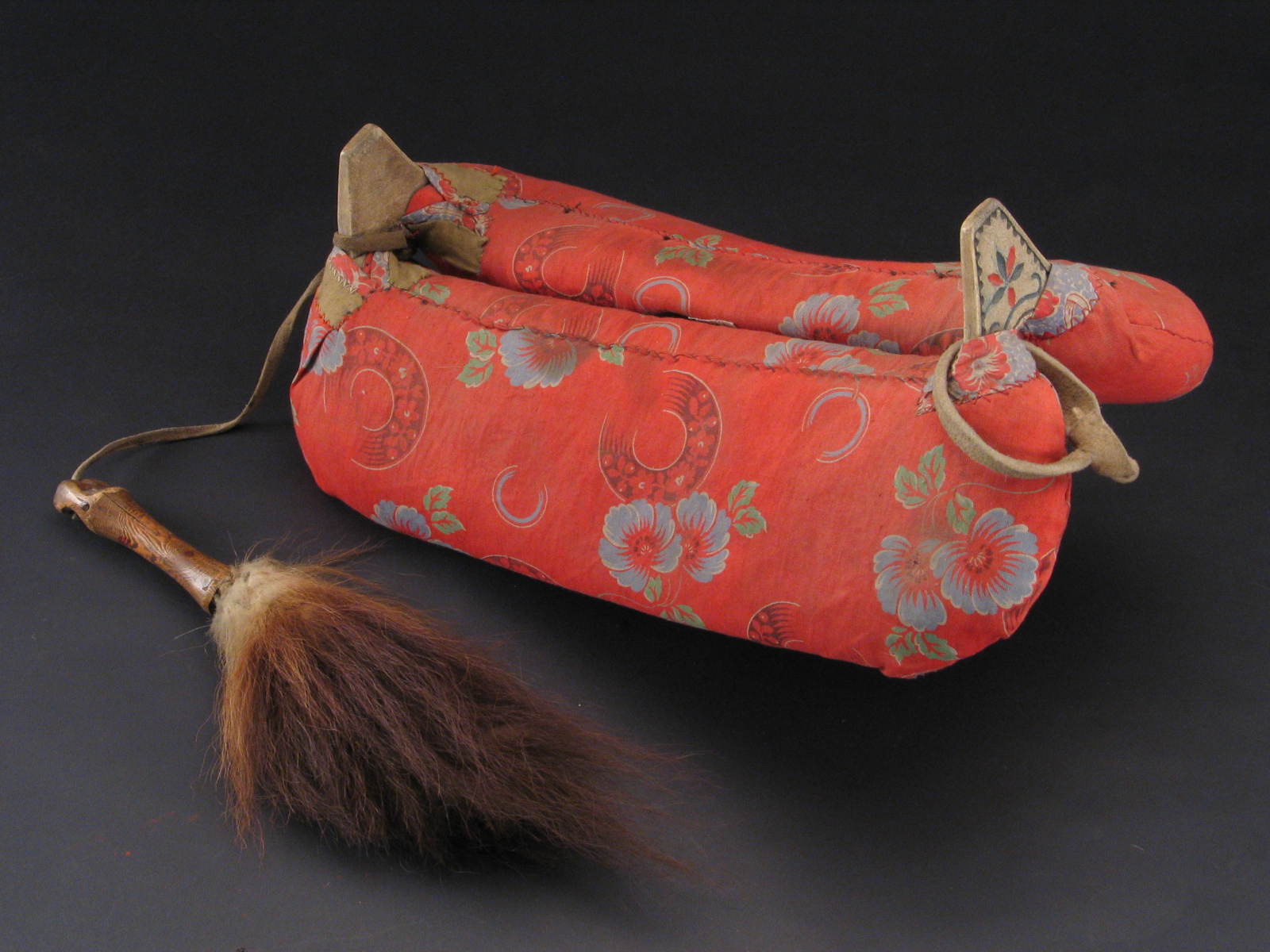 鄂溫克語稱“查拉巴額莫根”(使鹿鄂溫克),與馬鞍子基本相似,但稍小一些。鞍子前后都有“人”字形鞍橋額面,2個(gè)鞍橋間以鞍托連接,在鞍托骨架外裹皮制的內(nèi)塞獸毛或馴鹿毛的托墊,將托墊扣在馴鹿背上。另外還有一個(gè)鞍子附件“給勒寶烏亭”,與馴鹿鞍橋“人”字形結(jié)構(gòu)相似。以繩或皮條連接于鞍橋后面額下部,垂掛于馴鹿的后腿上部,為的是防止鞍子向前滑動(dòng)。在馴鹿鞍子前面也有同樣形式的較小的骨制品,叫“常蓋替恩”,一端與皮條與鞍橋前面額相連接,小骨制品垂掛于馴鹿脖子下面,是為了防止馴鹿鞍子向后滑動(dòng)。這2件馴鹿的附屬品上面和鞍橋上面都有精致的雕刻裝飾圖案。