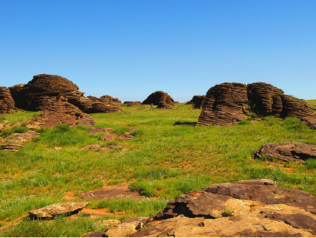 寶德爾朝魯草原石林旅游區(qū),位于錫林郭勒盟蘇尼特左旗達來蘇木境內(nèi),距二連浩特市198公里。旅游區(qū)長8公里,寬4公里,占地32平方公里,由無數(shù)露出的巖石群組成,屬大面積的花崗巖經(jīng)風(fēng)化侵蝕后的蝕余地貌。大自然的鬼斧神工使得一塊塊巨大的花崗巖體沿垂直和水平兩個方向的紋理裂隙風(fēng)化剝蝕,形成薄厚不一的層狀巖石,經(jīng)長期的風(fēng)蝕、凍融,形狀千姿百態(tài)。以廣闊平坦的草原為背景,怪石林立,造型奇特,像哲人深思、如雄鷹棲息、似群龜蠕動、若駿馬奔騰,四季景觀各異,如夢如幻,被譽為“草原石林”,實屬罕見。其典型特征是一根根、一座座石柱拔地而起,每根石柱間隔5米~7米。這些石林在地表并非一個整體,而是由一塊塊狀如餅子的石片堆積而成,有的雄偉,顯示出一種險峻挺拔之感。有的俏麗,給人一種婀娜多姿的印象,使人不得不折服于大自然億萬年的造化,由衷贊美這奇異的草原石林。