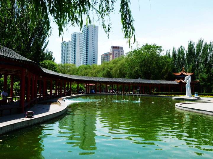 “藕塘煙雨”位置在公園東門(mén)入口處,設(shè)置半園型的藕塘一處,藕塘邊植垂柳,塘里種紅蓮,中間設(shè)置一個(gè)亭亭玉立的少女雕塑,象征著青春的活力,取名為草原之春,潺潺不斷的水哺育綠色的大地,在晨曦中水蒸氣覆蓋視野,絲絲的垂柳形成自然的煙雨,所以名叫“藕塘煙雨”。