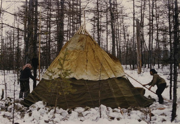 過去,鄂溫克人進山打獵、放牧馴鹿或采伐時,經常更換居住地點,為了便利,就搭蓋可拆卸的“仙人柱”,也叫“薩喜格柱”。鄂溫克語中“柱”意為“房屋”或“家”。“仙人柱”的構造主要有兩個部分組成,一部分是“柱”的木架子,叫“仙人”;另一部分是木架上的遮蓋物。中間屋頂處一般要有帶許多穿眼的圓木,用3根長約4米的木桿,細頭向上插進屋頂圓木的穿眼,使其三足鼎立成基本架子,再用20~30根輔助柱也插入穿眼中,形成木架。也有用3根上端帶叉的木桿(叫“蘇那”)做主柱,三叉相交后斜立成錐形,再搭上輔助柱構成框架。桿子的總稱叫“仙人”,門兩側的桿子叫“特儒翁”,內部中心近門處埋一根立柱“竊木卡”,桿的上端穿過“柱”的頂孔“柱奧拉尼”,由這立桿向門的相反方向系一橫桿“依嘎布佟”,是為掛鍋和燒水的壺用的。根據(jù)地區(qū)、條件和季節(jié)的不同,遮蓋物的材料也不同。寒冷季節(jié)則是以皮做圍子。其他季節(jié)多用樺樹皮覆蓋,樺樹皮苫蓋寬約1米,長近3米,一般要用7塊,下部用布圍子;也有蓋用牛毛細繩編的葦簾,簾上再蓋有草;還有用柳條編簾,再蓋葦簾子的房蓋。“柱”的門向南開或稍扁東南。