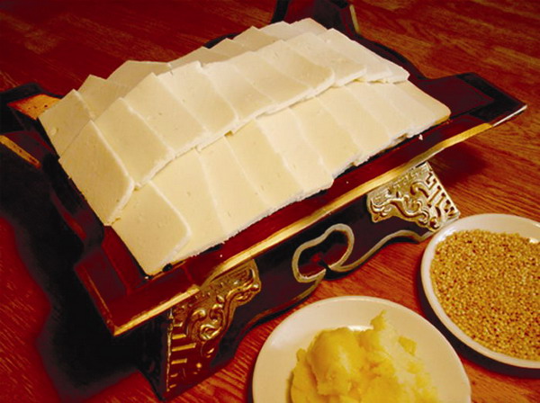 奶豆腐 奶豆腐是牧民一年四季常備奶食品之一。其做法是:將放置兩三天(夏季為一兩天)的脫脂酸奶中的凝結(jié)部分放入鍋中用微火熬煮,并不時攪拌,慢慢把黃色的汁液分解出來。待其稠糊時,用勺頭不停地揉搓擠壓,使其更具筋道后裝入木模中,曬干即成。以個人口味的不同可加入糖或野果制作,也可用各種各樣的模型制作。白色透明有油性的為上品,發(fā)黃較硬的次之。