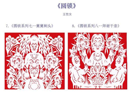 在呼和浩特地區(qū)的和林格爾縣,家長(zhǎng)給12歲的孩子過(guò)生日尤為隆重,具有鮮明的地域特色和民俗特質(zhì)。人們普遍認(rèn)為從這一天開(kāi)始,孩子的魂魄圓滿,這時(shí)要摘掉出生時(shí)佩戴的長(zhǎng)命鎖,標(biāo)志著孩子長(zhǎng)大。王枝女老人的這組剪紙作品就是反映了該地區(qū)圓鎖的民俗。由國(guó)家文化部命名的中國(guó)剪紙藝術(shù)之鄉(xiāng)和林格爾縣的著名民間剪紙傳承人王枝女老人,運(yùn)用剪紙連環(huán)畫(huà)的形式,分別通過(guò)拜認(rèn)干親、行掛鎖禮、掛鎖祈福、行開(kāi)鎖禮、長(zhǎng)輩訓(xùn)示、開(kāi)鎖圓福、舅舅剃頭、拜謝干親等主要流程來(lái)表現(xiàn),內(nèi)容豐富,場(chǎng)面宏大,具有抒情性和敘事風(fēng)格,有較高的民俗價(jià)值和美學(xué)寓意。(內(nèi)蒙古日?qǐng)?bào)社融媒體記者 趙丹)