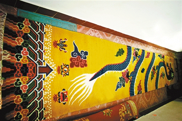 明清時期,地毯工藝更加細化,色彩更為豐富,圖案也更趨完美。康乾盛世期間,宮廷“如意館”御用畫師參與設(shè)計地毯,皇宮和寺廟鋪設(shè)地毯,文人富商均喜愛地毯,加速了地毯業(yè)的發(fā)展。據(jù)《大清會典事例》記載,雍正元年在北京設(shè)染織局,內(nèi)有九名技藝高超的匠人專為宮廷織造地毯。晚清時,僅北京就有官辦和民營的地毯作坊近300家,工匠達3萬人。