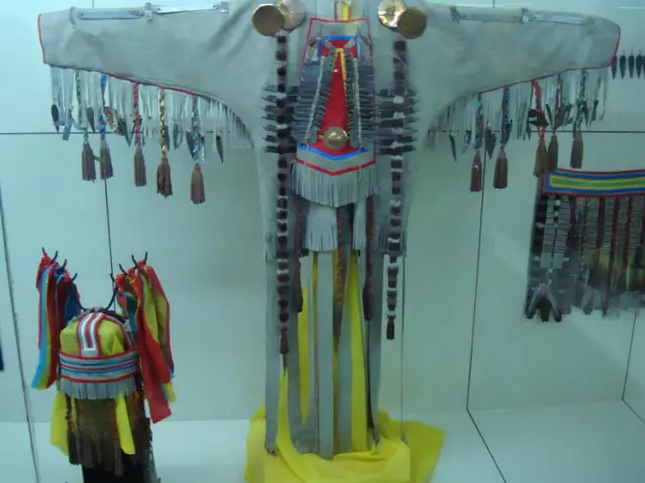 達(dá)斡爾族的薩滿服稱為“薩瑪石凱”,內(nèi)蒙古呼倫貝爾市海拉爾地區(qū)稱之為“扎瓦”。薩滿服是用柔軟的鹿皮裁制而成的,其款式是對襟的緊身長袍。