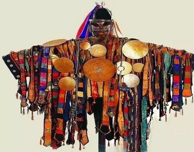 在薩滿長袍上還要套披肩,披肩上嵌有360個小貝殼,披肩的胸口處有1枚護(hù)心鏡,兩肩處有2個布制的鳥形(一雄一雌),稱為“博勒·綽庫爾”。
