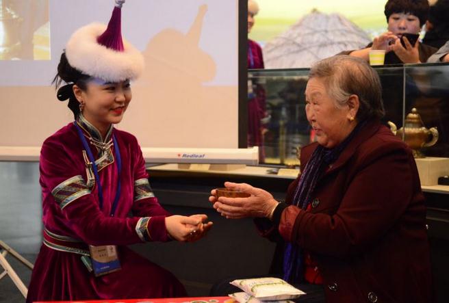 內蒙古博物院的講解員向長者敬上一碗剛熬制好的奶茶