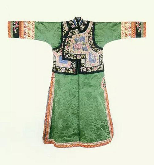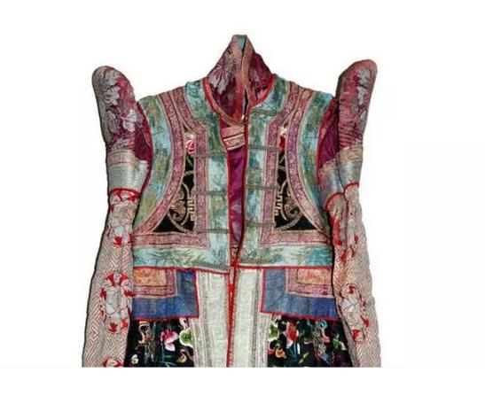 禮儀性大襟短坎肩是用花緞、柞絲綢、絲絨、平絨、以及繡有鏤金圖案的蔚藍色綢緞、黃色團花緞等有鮮艷色彩的高檔面料制成。這種短坎肩的領邊、領座、大襟、袖窿、下擺和4個開衩的邊緣都鑲有各種顏色的庫錦,并在各色沿邊兒之間鑲有鏤金彩條。短坎肩的內里鑲嵌著金銀曲線,在4個開衩的上角繡有方形或云形圖案。