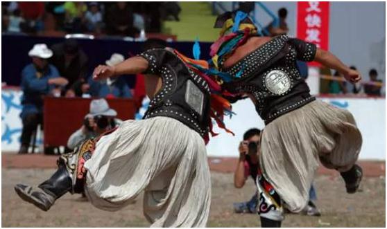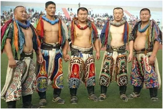 摔跤褲蒙古語稱“班扎拉”,多用十五六尺長的白色或各色綢料做成,不僅寬大多褶、活動方便,還顯得大方美觀。“班扎拉”的外面還要穿一種雙膝部位繡有各種象征吉祥的圖案無襠褲,蒙古語稱“圖呼”,具有護膝和裝飾的作用。