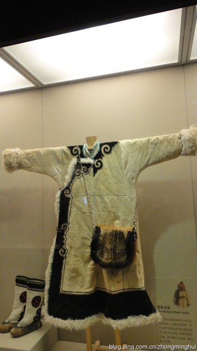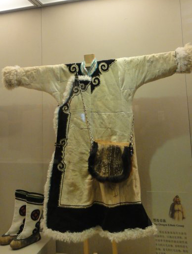 舊時(shí)鄂倫春人以狩獵為主,其民間服飾多以狍、鹿等獸皮制成。狍頭皮帽鄂倫春語(yǔ)稱“蔑塔哈”,系用帶角的狍頭皮制成,既可保暖防寒,又可用于狩獵時(shí)隱蔽自己。為防止狩獵時(shí)誤傷獵人,常將原狍子頭的兩耳豁下,換上用其他部位的毛皮縫制的假耳朵。鄂倫春人的袍子也用狍皮制成,冬季則選用毛長(zhǎng)絨厚的狍皮制作,稱為“蘇恩”。鄂倫春人皮袍男女不同,男袍通常前后開(kāi)襟,系黑色腰帶,女袍略長(zhǎng)于男袍,多系黃、紫、藍(lán)色腰帶或素色腰帶。狍皮褲分皮褲和套褲兩種,前者稱"額日克",用有毛絨的冬皮,后者用褪毛的短毛冬皮或短毛無(wú)絨的夏皮制作,僅有褲筒,沒(méi)有褲襠和褲腰,用皮繩系于腰帶上,套穿在褲子外面起保護(hù)作用。鄂倫春人的皮靴稱“奇哈密”,分高筒和矮筒兩種,用狍、鹿的腿皮縫制而成,冬季穿時(shí)內(nèi)襯烏拉草,并穿上狍皮襪子。鄂倫春人在冬季還穿一種稱為“奧路奇”的鞋,鞋幫用布制作。還用狍皮制成皮手套、皮被、皮睡袋等。