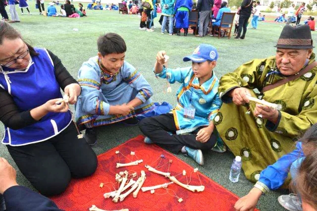 “夏嘎”即羊的踝骨。“夏嘎”分4個(gè)面,寬凸面叫背,寬凹面叫心,窄凸面叫目,窄凹面叫耳,蒙古語中分別稱為牛、馬、駱駝、羊。用“夏嘎”可以進(jìn)行多種游戲,如“賽馬”“摔跤”“射擊”“擠馬奶”“系羊”“走場”“九寶”“頂丁”等等。