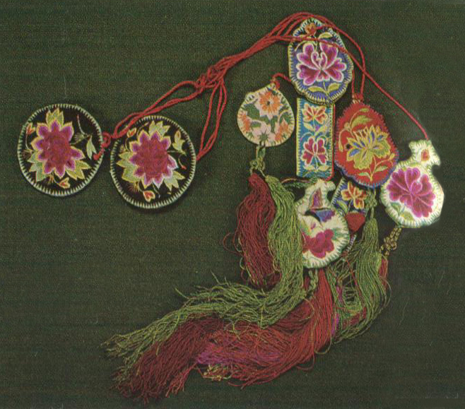 蒙古族不僅穿著鮮艷的蒙古袍,腰系寬厚的腰帶,頭戴棲鷹帽,腳蹬牛皮靴子,表現(xiàn)出了極具個性的民族特點,除此以外,蒙古族男女在裝飾上也很有特點。蒙古族男子傳統(tǒng)裝飾品有褡褳、鼻煙壺、煙袋、煙荷包、火鐮、蒙古刀、手鐲、戒指、圖海等。這些飾物融藝術(shù)性、使用性、裝飾性、保質(zhì)價性、攜帶性于一體。褡褳是裝鼻煙壺和哈達的長方形小袋子,懸掛在男子腰帶左前側(cè)。鼻煙壺是蒙古族男子吸鼻煙及相互請安問候的禮儀工具。火鐮是火柴未進入草原前蒙古族主要的取火工具。蒙古刀、銀碗、戒指等,也是蒙古族男子喜歡的飾物。蒙古族婦女的裝飾主要用金、銀、珍珠、珊瑚、瑪瑙、翡翠、琥珀、綠松石、青金石等名貴材料制作,品種有額箍、墜子、孛勒、發(fā)套、荷包、希勒波其、腦后垂飾、手鐲、戒指、項鏈等。額箍是蒙古婦女頭飾中最尊貴的飾品,一般由套圈、額穗子、瓔珞、腦后穗等組成,在重大喜慶節(jié)日才要戴。墜子是蒙古族已婚婦女日常佩戴的輕便頭飾,孛勒是掛在長坎肩面?zhèn)纫赶碌你y質(zhì)裝飾,希勒波其是戴在腦后和背后鑲嵌大量珊瑚的銀質(zhì)裝飾。蒙古族婦女還喜好戴各色貴重金石制作的手鐲、戒指、項鏈等。