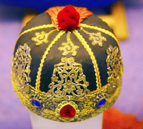 便帽:俗稱小帽或瓜皮帽。它以六瓣合縫,上銳下寬,底邊上有的鑲以一寸寬的小檐;在帽頂上要綴一個用絲絨結(jié)成的大疙瘩,俗稱“算盤結(jié)”,紅黑不等。為區(qū)別帽子的前后,需在帽檐的正中釘一“帽正”。帽正的質(zhì)地不一,富有者多用珍珠、玉石、翡翠、瑪瑙、珊瑚等為之;八旗平民則用燒藍(lán)、玻璃和小銀片等為之。清朝時,滿族老幼均喜戴便帽,冬春時一般以黑素緞為面,夏秋時則多用黑實地紗為面,而滿族農(nóng)家則多喜戴氈帽。據(jù)《嘯亭續(xù)錄》記載:滿族“士大夫燕居皆冠便帽。其制如暖帽而窄其檐,其上用紅片錦或石青色,緣以臥云如葵花式,頂用紅絨結(jié)頂,后垂紅縵尺余,無老少貴賤皆冠之。”這種帽子的式樣較多,有光頂、平頂、硬胎、軟胎之別。清朝時,該帽尤以綏遠(yuǎn)城滿族最為典型。20世紀(jì)60 年代,該帽者逐漸消失。