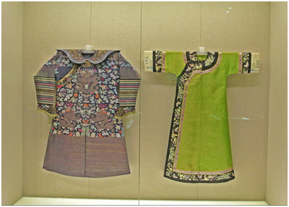 清代,滿族婦女的服裝與男裝一樣,以袍服為主,但式樣為直立式寬襟大袖長袍,且在領口、袖口、衣襟等處,鑲嵌有數道花紋紋式,與漢女裝保持著涇渭分明的形制。清初的婦女旗袍具有簡約和實用的特點,外部輪廓呈長方形直筒式,為圓領口,窄袖,有扣絆,衣襟左衽,兩腋部分明顯收縮,袍下部開衩,下擺寬大;袍長垂至腳踝,袖口平面大,從上至下由成塊衣料剪成;衣領和袖口處鑲邊較窄,顏色較素。清朝中期,女袍的樣式有所變化,袍身和袍袖比清初期寬大,除傳統(tǒng)的圓領外,又出現(xiàn)了狹窄的立領。清朝后期,旗袍的樣式又有發(fā)展,袍身較為寬博,肥袖過肘,扣絆右側,下擺開衩,造型線條平直硬朗,外形以直線為主,兩腋的收縮不很明顯,多喜用高領,領高及腮可碰到耳垂;袍身之上多繡有各色花紋,領、袖、襟、裾都飾有多重寬闊的滾邊,最多達“十八鑲滾”。這種重視鑲滾裝飾的風氣是清末滿族婦女服飾的一大特色。衣襟前掛有金或銀制的裝飾物,如耳挖子、鑷子、牙簽等,有的還掛有裝香料的小香囊、荷包等。在清代內蒙古地區(qū),尤以綏遠城滿族和喀喇沁旗十家滿族鄉(xiāng)婦女的旗袍最為典型。
