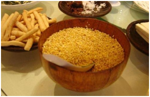 其他米食還有:蕎麥米是把蕎麥在鍋里蒸沸,經(jīng)炕干后碾成的米,達(dá)斡爾語稱“阿勒莫”,蕎麥米磨成粉過羅后,留在羅上粒狀的部分,即是“蕎麥臍子”,達(dá)斡爾語稱“尼基”,用做酸奶稠粥,吃時(shí)拌黃油和糖,是達(dá)斡爾人的上等食品。另外蕎麥米可與稷子米或小米做二米干飯,亦可做酸奶蕎麥米粥,年節(jié)的時(shí)候吃完肉食后,以酸奶蕎麥米粥充夜宵。蕎麥米還可做狍子肉粥,味美可口。把燕麥炕干后碾成米,可做燕麥米鮮奶粥和燕麥米狍子肉粥,這些是達(dá)斡爾族老年人最喜愛的食品。達(dá)斡爾族也用小米做干飯和粥,做摻蕓豆玉米碴子粥,拌酸、鮮牛奶或搭配其他湯、菜食用。近十幾年來食用大米逐漸增多,大米是從集市上購買的,用它燜干飯或熬粥。