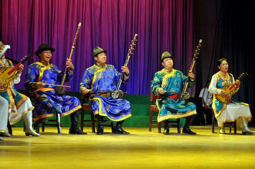 “額勒古格”好來寶,即由多人集體演唱的敘事好來寶。其曲調豐富,由單一的馬頭琴或四胡伴奏發(fā)展為綜合性的小樂隊伴奏。這種好來寶多由烏蘭牧騎或群眾業(yè)余文藝隊演出。