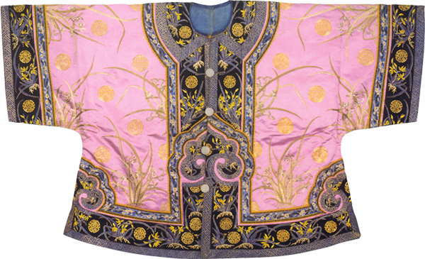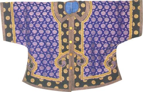馬褂是八旗將士騎馬時常穿用的一種外褂。其基本形式為圓領(lǐng)、對襟、開衩,身長至臍,袖長及肘,并有扣絆,常和旗袍匹配穿用。
