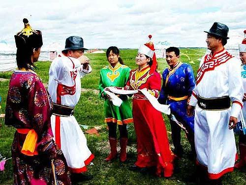 或牛角杯中敬人。在較隆重的場合,也有將酒杯托在哈達上,唱著歌敬酒的情況。