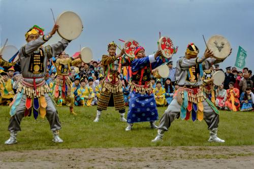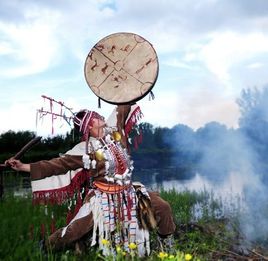 如:手握神鼓飛快地?fù)u動,腳部動作有力踏地,節(jié)奏非常快,并在旁邊伴唱人的協(xié)助下迅速翻轉(zhuǎn)身,并挺直身體,與地面形成45度角。并邊擊神鼓邊唱祈禱詞。伴舞的鼓法上主要有擋臉鼓、碎打鼓、飛鼓和煽鼓,每種鼓法伴有咒語諧謂音律,節(jié)奏感極強(qiáng),舞蹈時薩滿服裝上的銅鏡、銅鈴、銅片等裝飾品,有節(jié)奏的叮叮鐺鐺作響,伴著薩滿吟誦聲,整個舞蹈頗有原始宗教的神秘色彩。