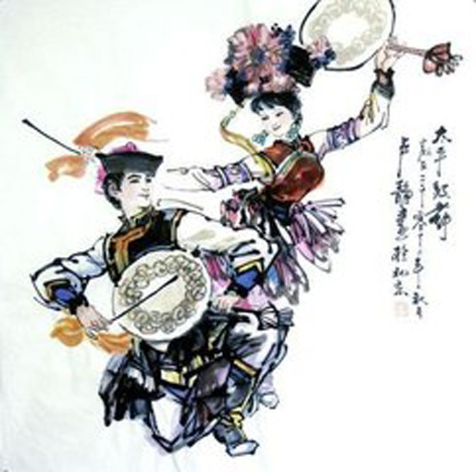 太平鼓早在遼金時期就流行于女真人中,清代得以迅速發(fā)展為自娛性歌舞。據(jù)《燕京歲時記》記載:“太平鼓者,系鐵圈之上蒙以驢皮,形如團(tuán)扇,柄下綴以鐵環(huán)。兒童成群,以藤杖擊之,鼓聲冬冬然,環(huán)聲錚錚然,上下相應(yīng),即所謂迎年之鼓也。”又據(jù)《燕京瑣聞錄》記載:“清入關(guān)征討各地,凡攻克一城,則打太平鼓,以茲慶賀之意也。”太平鼓的表演形式有兩種。一是“邊打邊舞”,即表演者隨著不同套路的鼓點扭出不同的舞蹈動作;二是“間打間唱”,即打一通鼓點,唱一段曲兒,可唱曲牌、故事、傳說、典故等,也可借景抒情,出口成章,即興演唱。時至今日,呼和浩特市新城區(qū)滿族小學(xué),一直把表演太平鼓當(dāng)作民族的傳統(tǒng)節(jié)目。每逢喜慶佳節(jié),50多名兒童,身著艷麗的旗裝,邊歌邊舞,不僅深受滿族同胞的喜愛,也深得蒙漢回各族人民的贊賞。