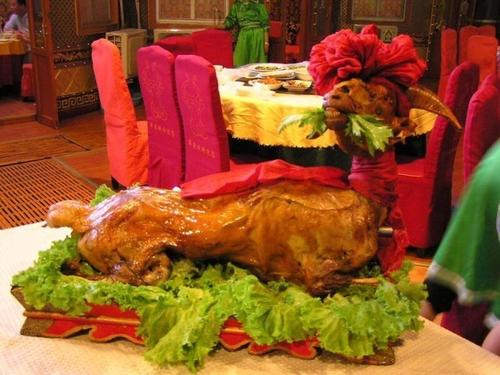 湯羊席即詐馬宴,是蒙古族很古老的一種宴席。即將二歲(鮮嫩時(shí))綿羊宰殺后不剝皮,用開水將毛煺去,整羊下鍋煮熟后,盛入木或銅盤放到桌上,頭朝主賓席,致答完宴席頌詞后,用刀切割食之。食用前,先割一塊敬天、再敬地、敬山神、樹神、水神、鬼、祖宗、汗,然后大家分食。