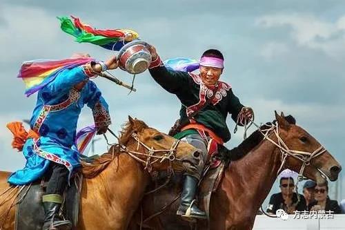 之后,牧馬人把馬群趕回,這時青年牧人施展自己的騎技,套取二歲馬。馬被套中后,一個牧人趕過去,揪住馬耳朵,將馬絆倒,或是揪住馬尾巴,縱馬前奔,一拽尾巴,用一股巧勁使其倒地,然后牧人們趕上去把馬按住,給馬剪鬃、割尾梢、除壞牙。這時馬的主人把自家的畜印燒紅,烙在馬的后腿上部。如果是獻給薩滿的馬,主人要用一個木碗盛滿牛奶,將牛奶從馬的兩耳中間直澆到尾根。富裕的人家還要舉行賽馬、摔跤等活動,以牛、羊獎勵優(yōu)勝者。