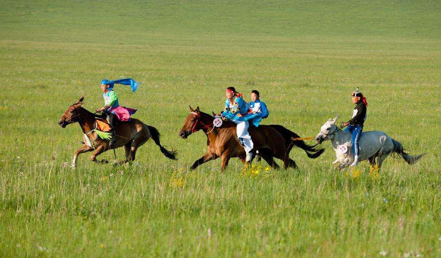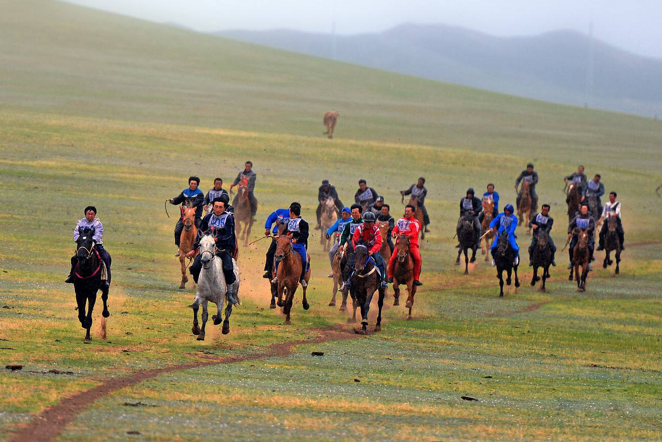蒙古族牧民從小成長于馬背之上,精通于騎術、善于馴服烈馬是優(yōu)秀男子的重要標志。蒙古族賽馬大體上可分為快馬賽和走馬賽兩大類別。除此之外,蒙古人還要依據(jù)參賽馬的歲數(shù)和性別,進行不同的賽事。如:二歲馬賽和兒馬賽等。賽馬活動通常是在祭敖包、那達慕大會或一些民間節(jié)日時與搏克、射箭比賽同時進行,也可單獨進行。人數(shù)無限制,少則十幾人,多則百余人。快馬由少年兒童乘騎,走馬則由成人乘騎。進行快馬比賽時,一般要選擇精于乘騎、聰慧靈敏、鎮(zhèn)定勇敢、勤學善記、謙虛謹慎、聽從教導的,體重在30公斤~40公斤,年齡居于9歲~14歲間的少年為賽手。比賽以草原為賽場,直線賽跑,通常為25公里~35公里。終點往往要設于那達慕會場等觀眾匯集之處。參賽馬匹要由經(jīng)驗豐富的“烏亞其”(吊馬師)經(jīng)過精心挑選、調養(yǎng)和訓練方可參加競賽。比賽時賽馬一律不備鞍轡,騎手不穿靴襪、身著彩衣,頭戴帶有鏡子的花帽或五彩綢巾驏騎于馬背。同樣,參賽駿馬的額毛、尾巴也要加以裝飾。開賽前“烏亞其”要領著乘騎駿馬的騎手入場列成縱隊,而后在年長的“赫納格其”(裁判員)的帶領下順時針(順太陽繞轉的方向)繞起點三圈,蒙古語稱“查查爾·鄂日格胡”。之后,要走到起跑線附近縱隊排列,等待比賽開始。此時,由歌手唱起贊歌——“圖門乃·鄂赫”(意為萬馬之母),并伴以“亨古”曲調,為馬匹和賽手助威。“赫納格其”(裁判員)用哨子或小旗發(fā)出指令,賽手們則立刻策馬揚鞭,風馳電掣,競相追趕,以到達終點的次序排列名次。第一個到達終點的賽馬被冠以美稱“圖門乃·鄂赫”,獲得前五名的賽馬要接受馬奶洗禮,并被冠以美稱“艾日根·塔布”,意思是接受了馬奶洗禮的五匹駿馬。蒙古人將最后到達終點的賽馬稱之為“阿拉坦·散達里”,即金凳子(比喻其步伐沉重),用幽默詼諧的贊頌詞解釋其遲來的原由,并祝愿它在將來比賽中跑得像黃羊一樣快。對“阿拉坦·散達里”贊頌和鼓勵,體現(xiàn)出了蒙古人對弱勢群體的關愛之情。賽馬這一傳統(tǒng)活動已列入中國少數(shù)民族體育運動項目。