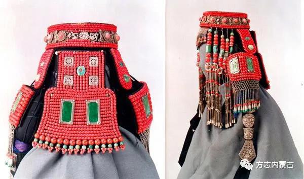 鄂爾多斯地區(qū)蒙古族婦女有戴頭飾之俗。鄂爾多斯頭飾包括臉垂和發(fā)套兩大件。臉垂,是把特制的木胎用布縫制而成,長5寸左右,狀如棒槌,其上端飾以白銀,鑲嵌珊瑚、珍珠等各色飾物,同發(fā)辮連結(jié)起來,垂至兩頰,故稱臉垂。發(fā)套是戴在頭上的首飾,上邊綴滿珊瑚、珍珠、綠松石和銀質(zhì)花的圓形頭環(huán)。前有流蘇,旁有流穗,尤顯富麗堂皇。因為是完整的頭環(huán),戴取均十分方便。發(fā)套是白天戴上,晚上取下來,只有臉垂是長年戴的。清末至民國時期,做一個中等水平的發(fā)套,價值相當于三四匹優(yōu)質(zhì)騸馬的價格。